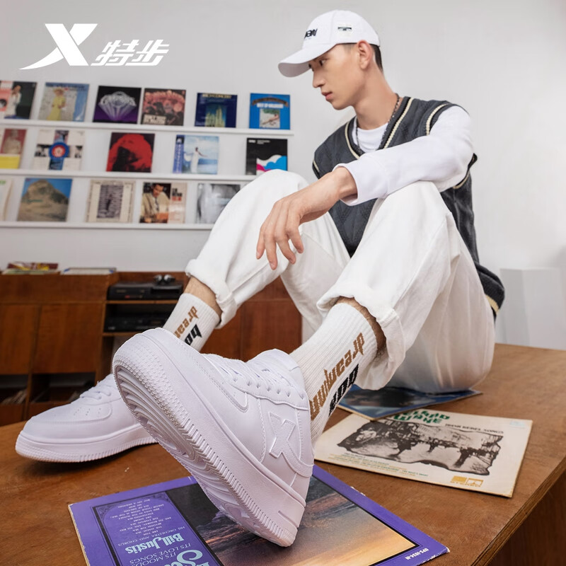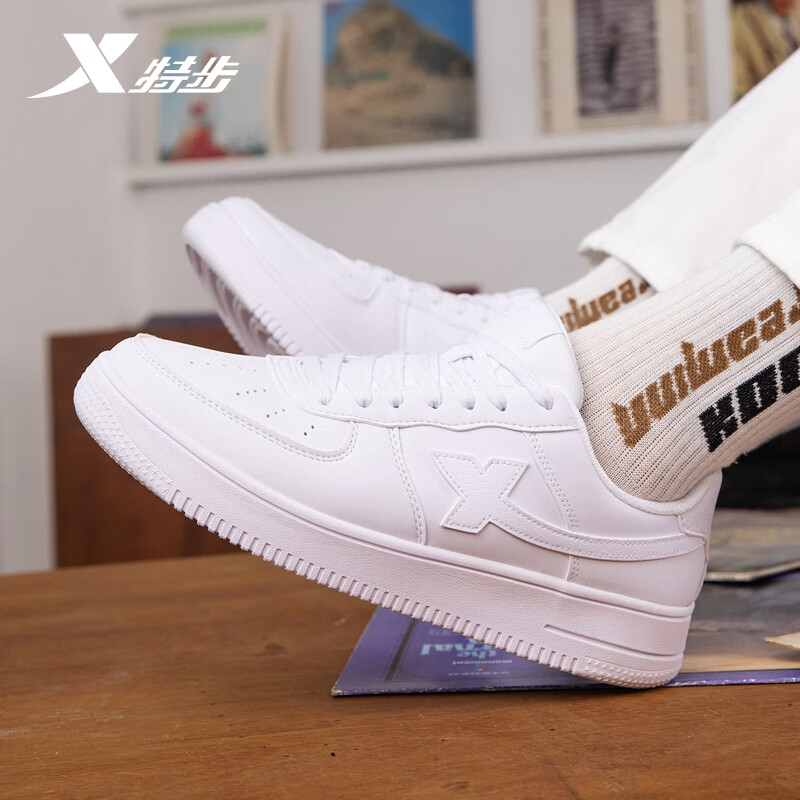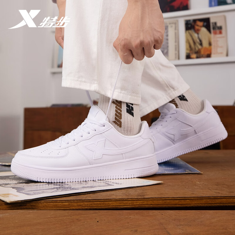 特步情侣男女板鞋小白鞋空军一号冬季革面保暖运动板鞋休闲鞋