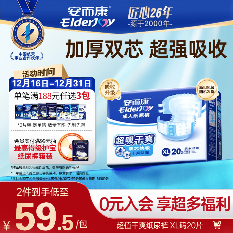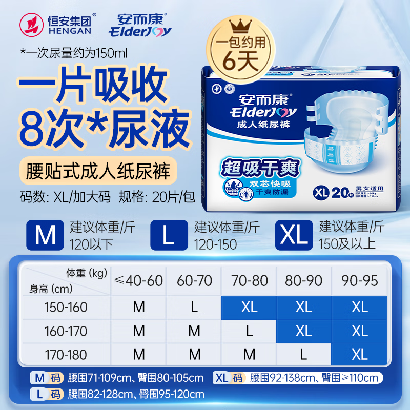 安而康(Elderjoy)超吸干爽成人纸尿裤XL20片臀围>110cm成人尿不湿老人快吸防漏