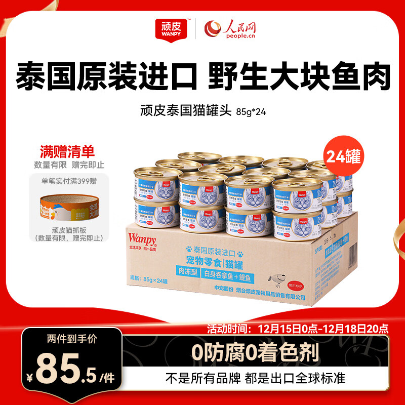 顽皮(Wanpy)泰国进口 猫罐头85g*24罐 白身吞拿鱼+鳀鱼罐头(肉冻型) 成猫零食