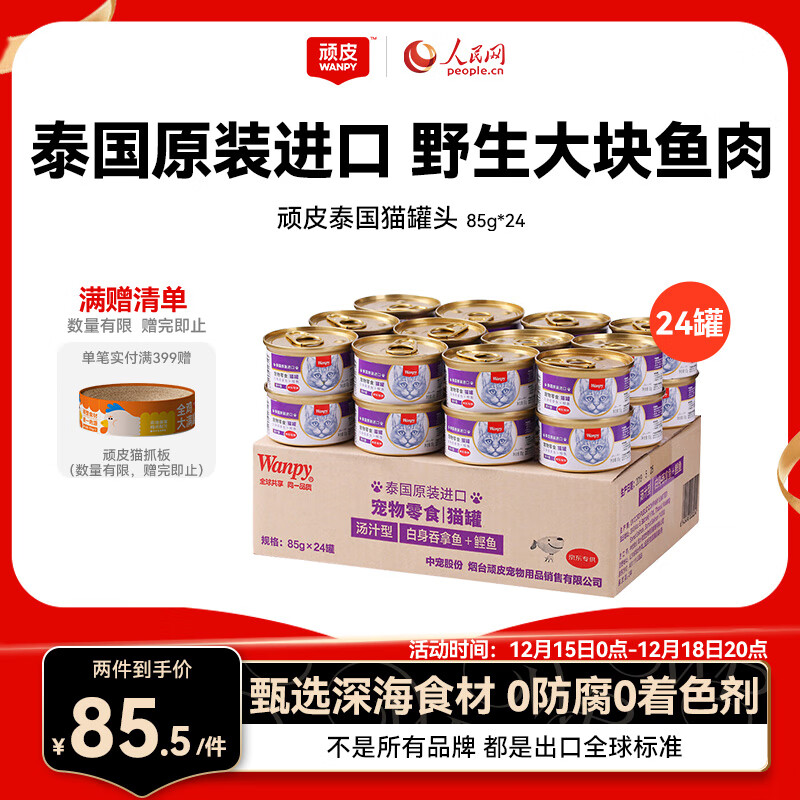 顽皮(Wanpy)泰国进口 猫罐头85g*24罐 白身吞拿鱼+鲣鱼罐头(汤汁型) 成猫零食