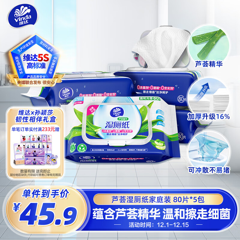 维达(Vinda)湿厕纸 家庭装80片*5包 芦荟精华 加厚洁厕湿纸巾厕纸湿巾可冲散