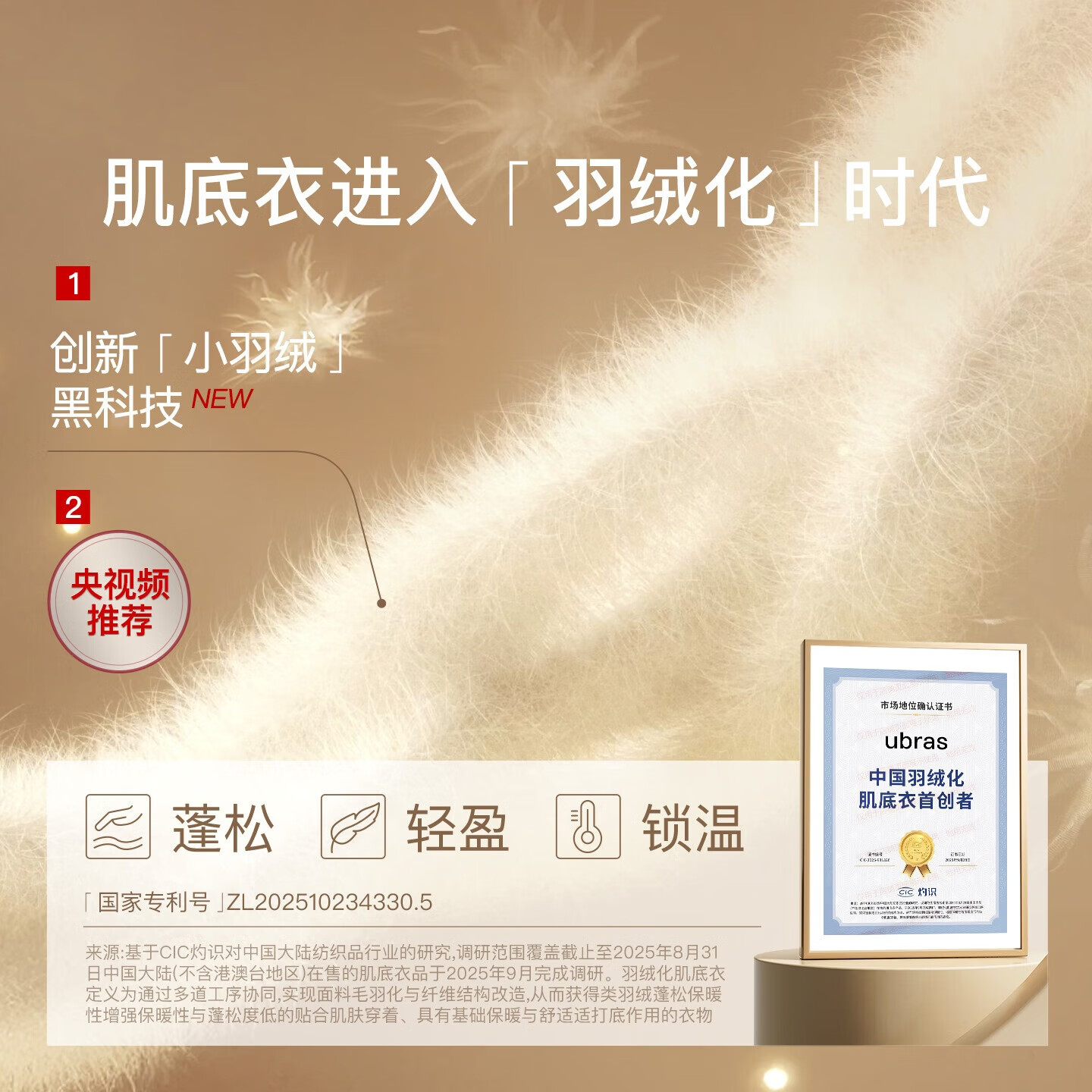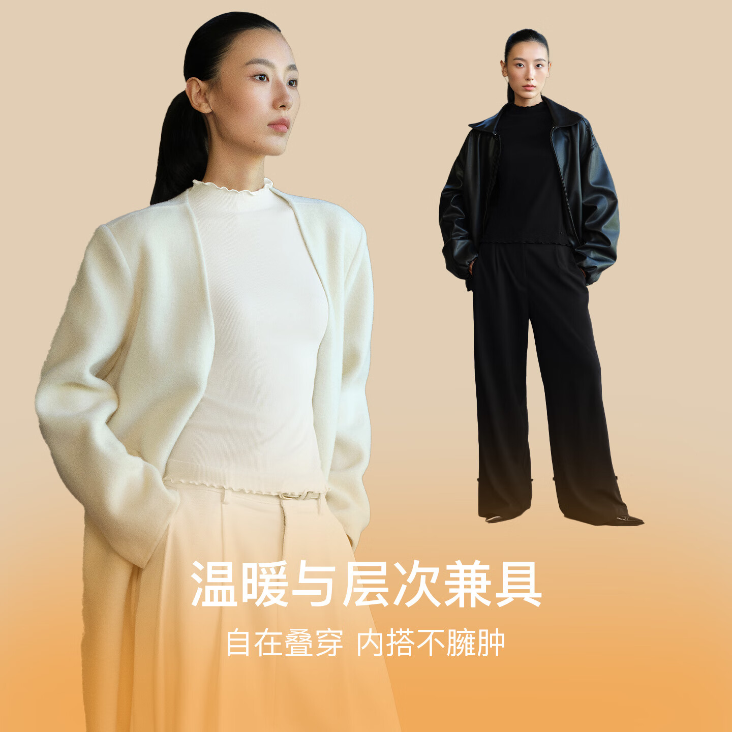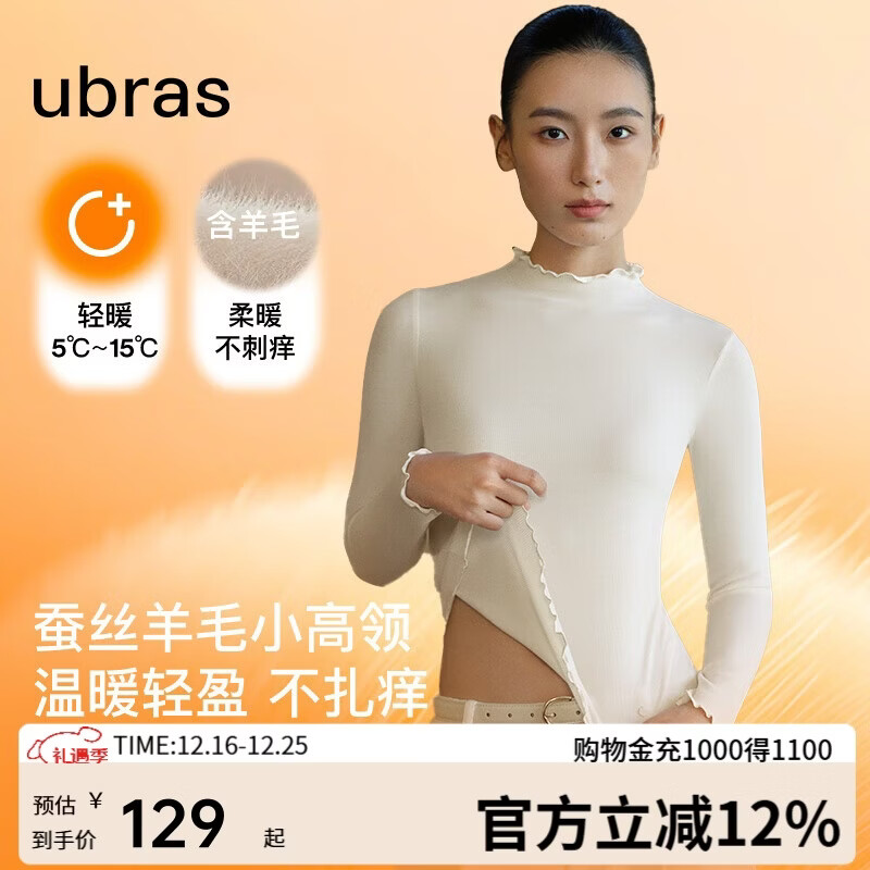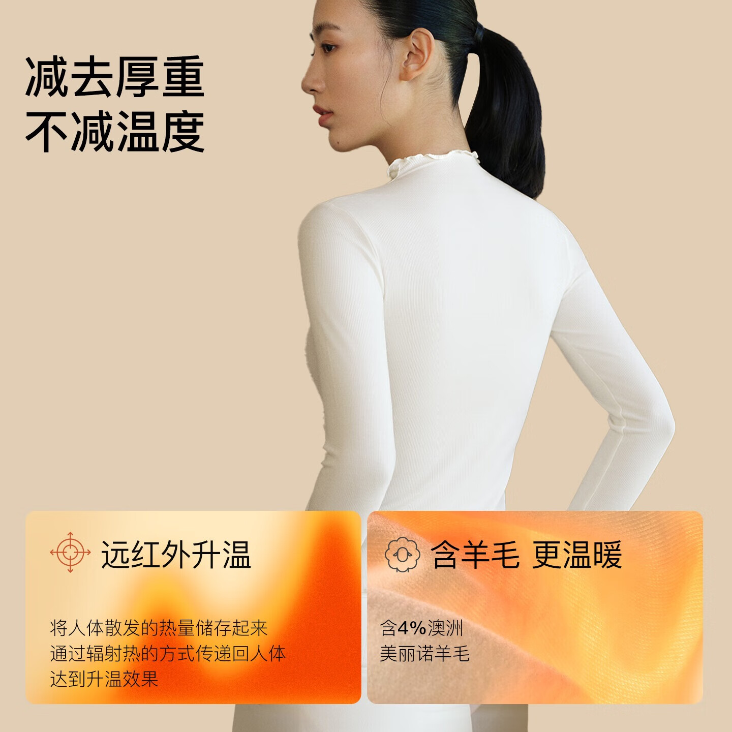 ubras新款木耳边羽绒化蚕丝羊毛保暖衣女秋冬打底内搭肌底衣 奶油白色L