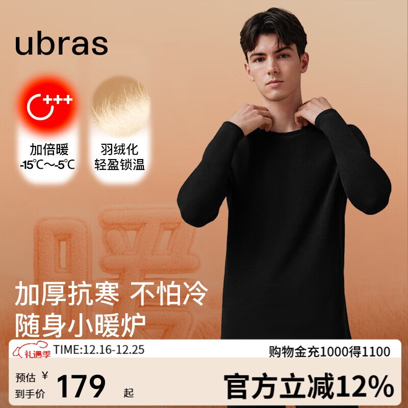 ubras新柔暖羽绒化肌底衣套装男保暖秋衣秋裤情侣打底加倍暖漆黑色 XL