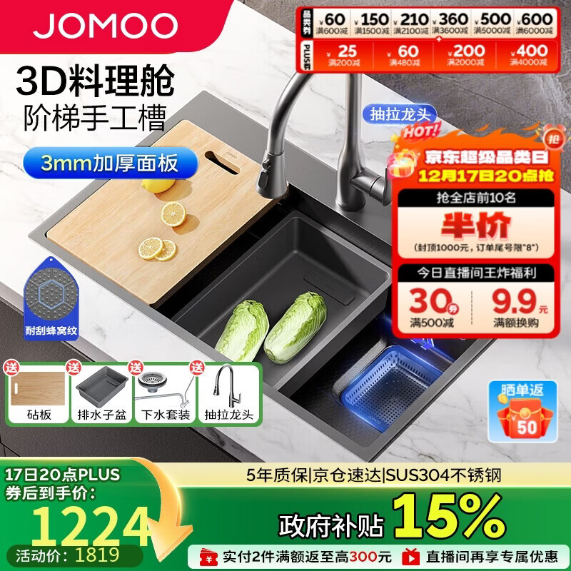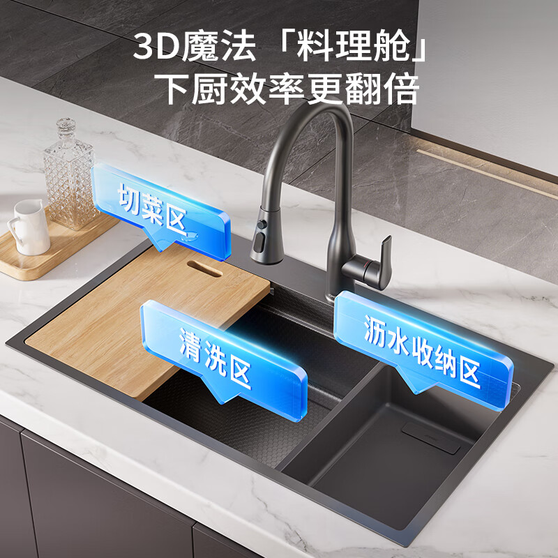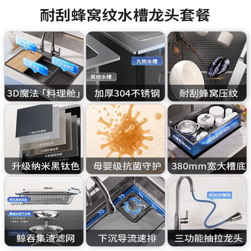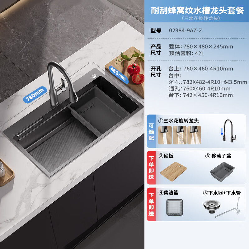 九牧(JOMOO)压纹水槽大单槽洗菜盆厨房不锈钢手工洗碗槽78*48抽拉龙头02384
