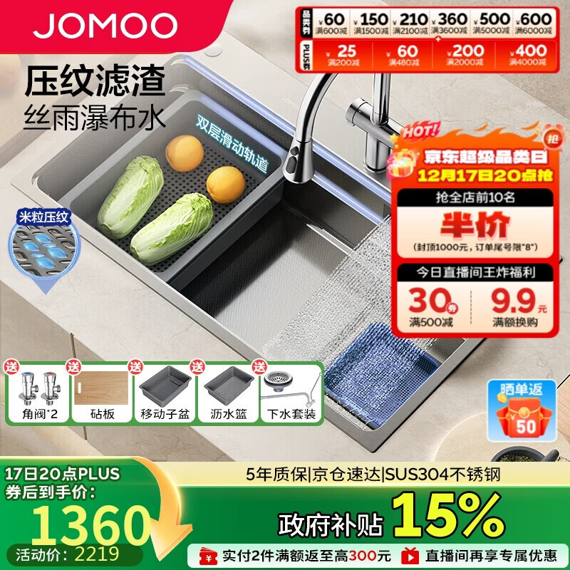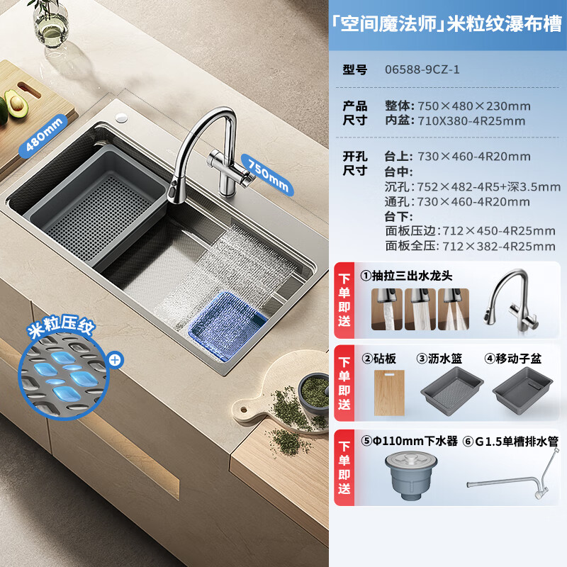 九牧(JOMOO)不锈钢魔法师压纹飞雨水槽大单槽滤渣洗菜盆75*48抽拉龙头06588