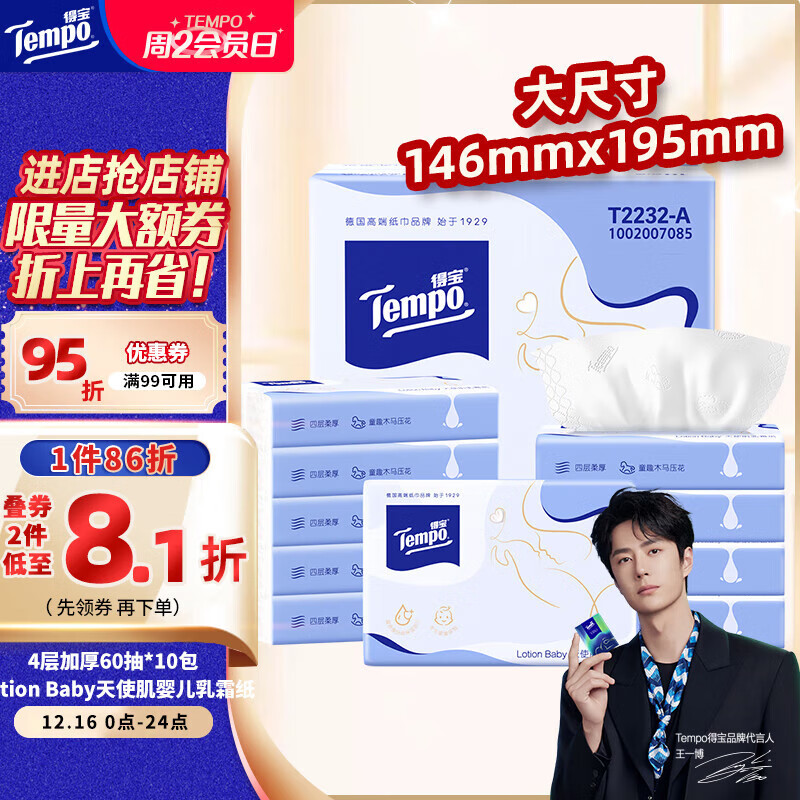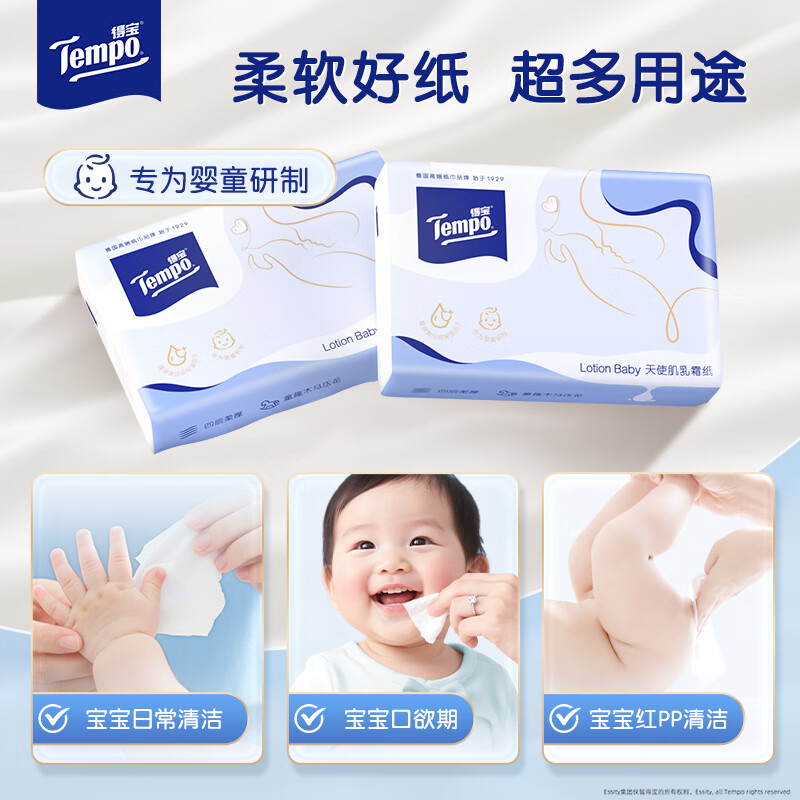 得宝(TEMPO)Lotion Baby天使肌婴儿乳霜纸 4层加厚60抽*10包 云柔巾 保湿纸巾