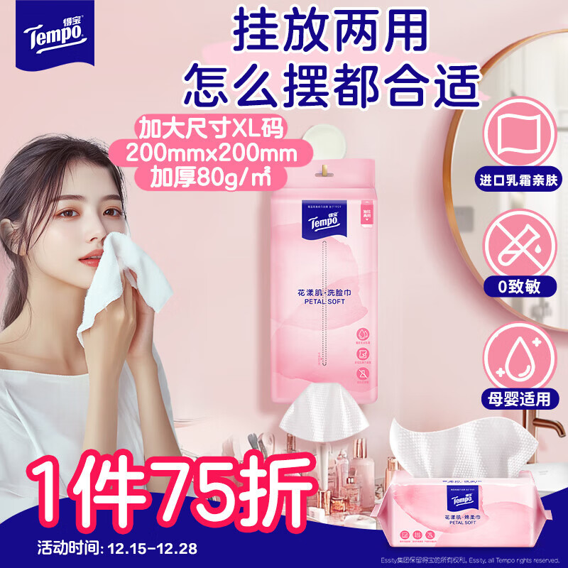 得宝(TEMPO)洗脸巾 70抽*1包 悬挂式 一次性毛巾 超柔乳霜护肤 绵柔巾婴儿