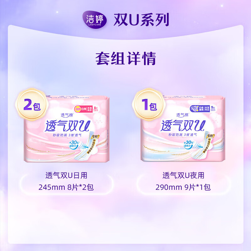洁婷绵柔卫生巾透气双U日夜用姨妈巾组合套装 双U日夜组合25片