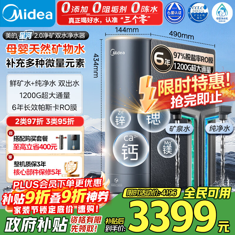 美的(Midea)家用净水机星河2.0净矿净水器双水直饮1200G6年RO矿物质0阻垢剂杀菌反渗透厨下式净饮pro升级系列