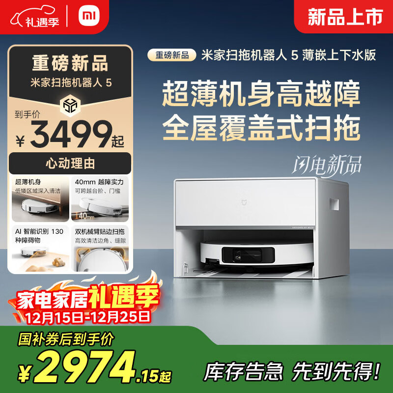 米家新品 小米扫拖机器人5 超薄机身扫地机器人扫拖一体自动清洗全自动上下水