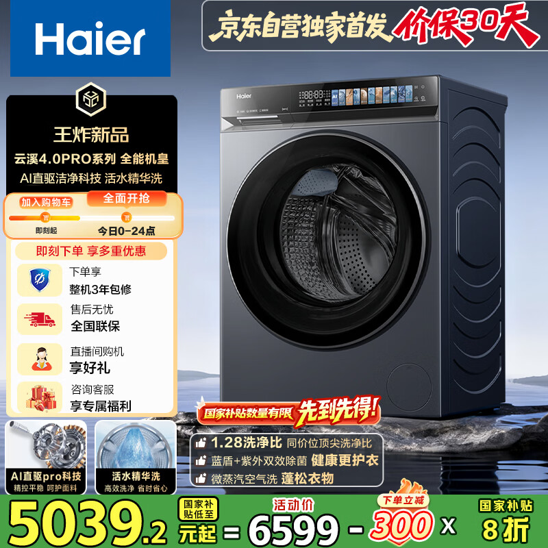 海尔(Haier)云溪4.0Pro滚筒洗衣机全自动带烘干洗烘一体10公斤京东自营7KJ3超薄家用国家补贴一级能效以旧换新