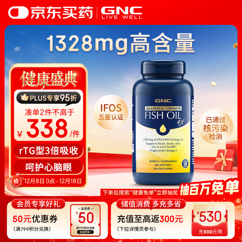 GNC健安喜高纯度深海鱼油omega3 dha 鱼油降血脂非鱼肝油中老年240粒