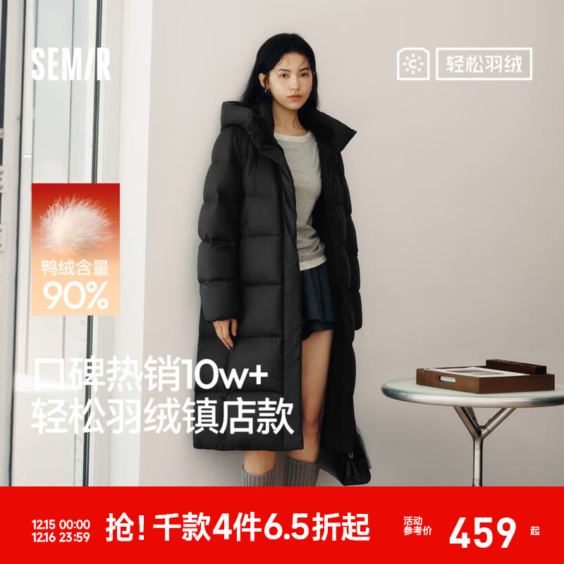 森马(Semir)陈都灵同款|90绒子长款羽绒服女2025冬新款三防H版型显瘦连帽外套 [雅黑]黑色(灰鸭绒)90001 M