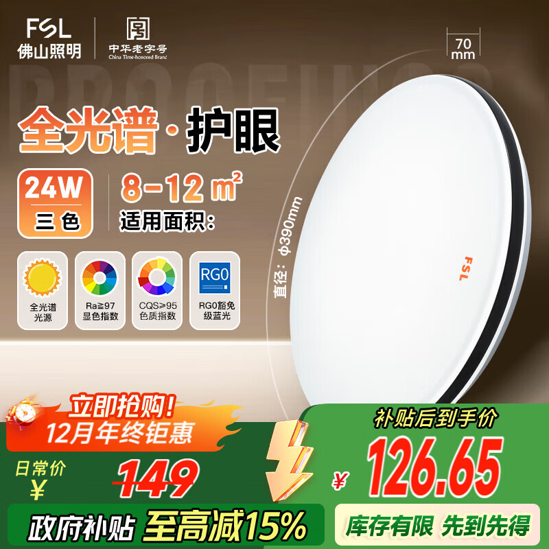 FSL佛山照明全光谱护眼吸顶灯调色卧室灯低蓝光Ra97悦夕24W圆