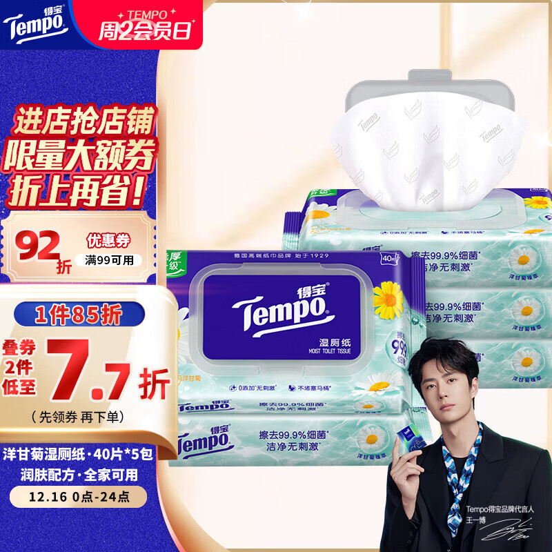 得宝(TEMPO)一博同款 洋甘菊湿厕纸 40片*5包 植萃精华 可冲散 湿纸巾 湿巾