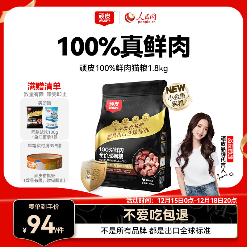 顽皮小金盾猫粮100%鲜肉全价成猫1.8kg 鸡肉呵护肠胃【欧阳娜娜推荐】