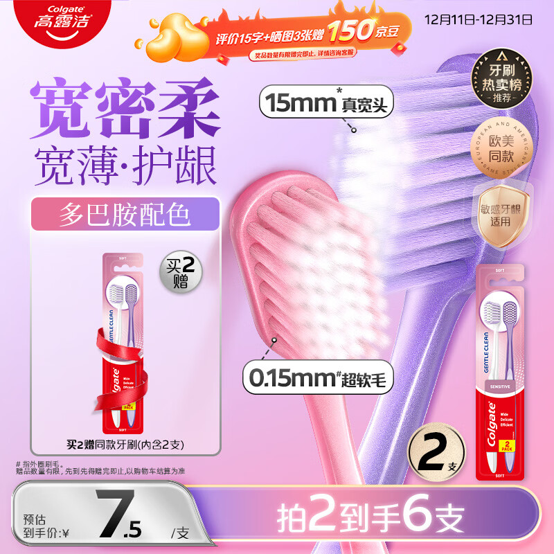 高露洁(Colgate)宽密柔多巴胺宽头牙刷2支 超软毛成人牙刷小头男士女士敏感牙龈
