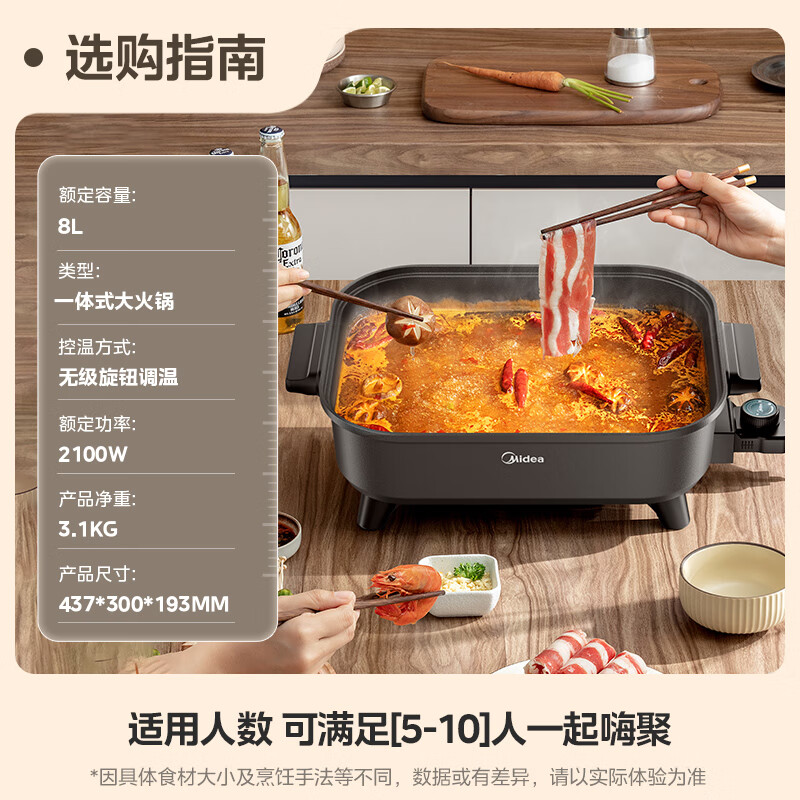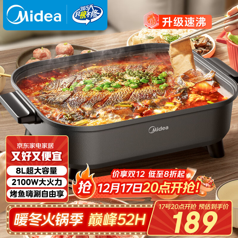 美的(Midea)火锅专用锅 电火锅 烤鱼锅6分钟速沸电锅一体多功能锅电煮锅火锅锅 8L大容量 HGE383051