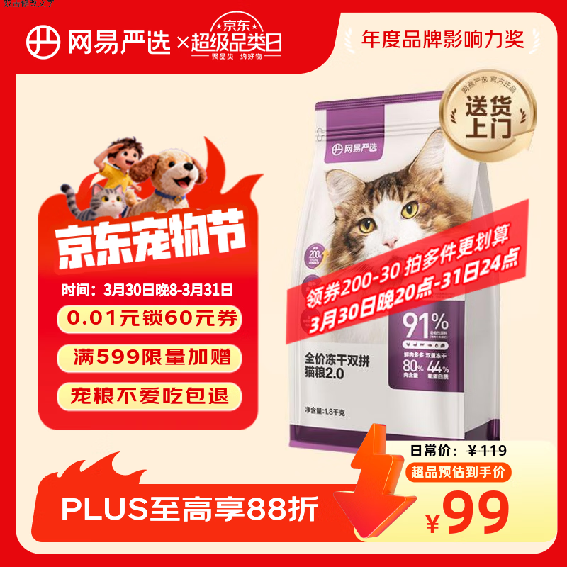 网易严选全价冻干双拼猫粮 主粮成幼猫无谷高鲜肉好适口 美毛护胃1.8kg