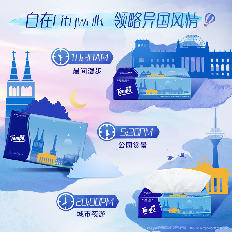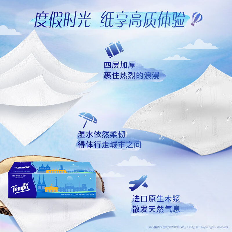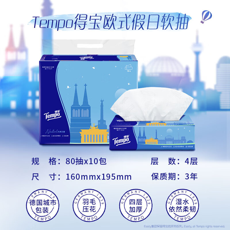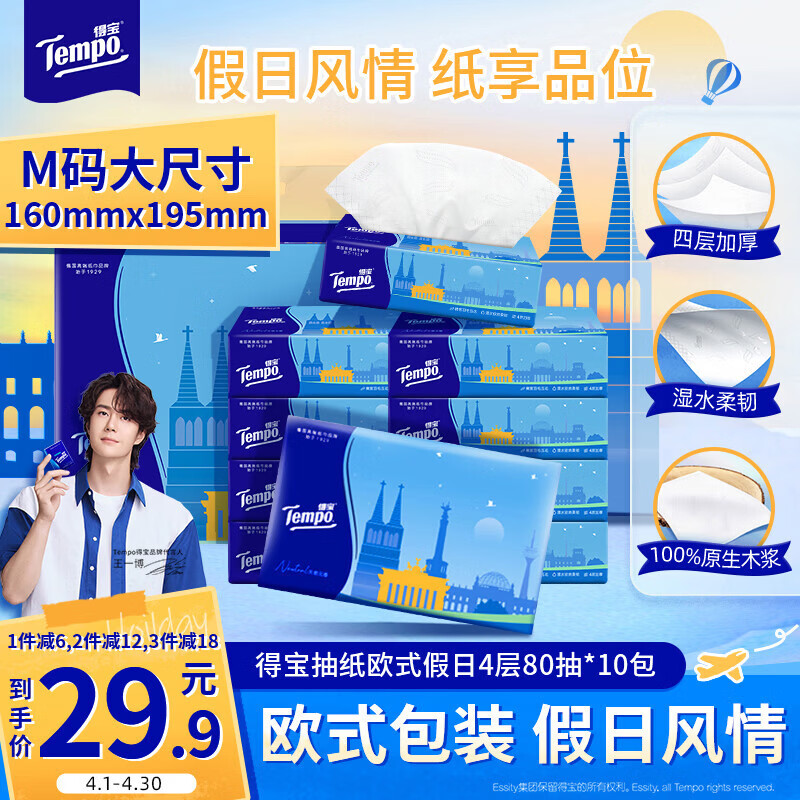 得宝(TEMPO)一博同款 抽纸 欧式假日4层80抽*10包 湿水不易破 真M码 纸巾单提