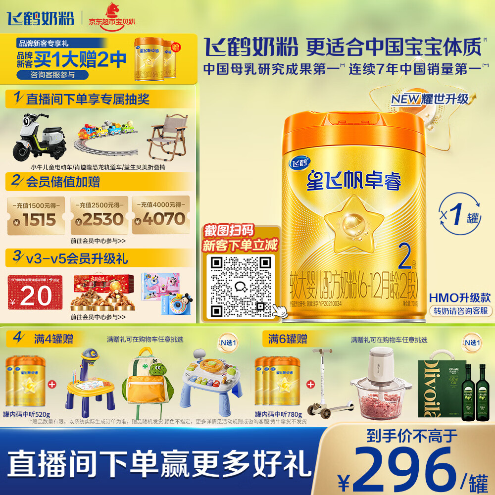飞鹤星飞帆卓睿Pro A2β酪蛋白婴儿配方奶粉2段(6-12月)758g 育儿补贴