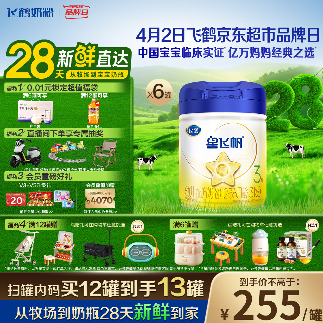 飞鹤星飞帆 幼儿配方奶粉3段(1-3岁)900g*6罐【28天新鲜直达】专利OPO