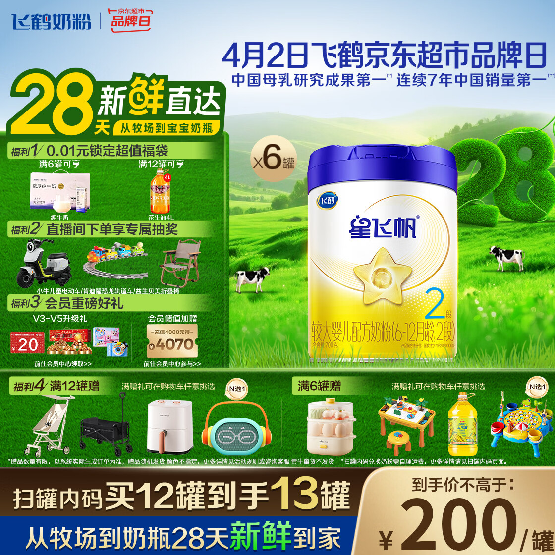 飞鹤星飞帆婴幼儿奶粉2段(6-12月) 700g*6罐 28天新鲜直达