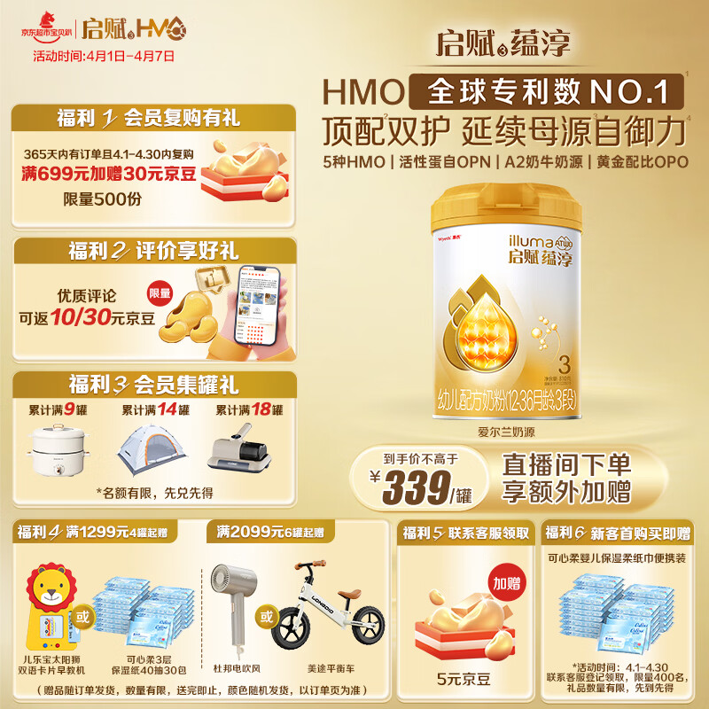 惠氏(Wyeth)启赋蕴淳进口幼儿配方奶粉3段(12-36月)810g A2奶源HMO黄金含量