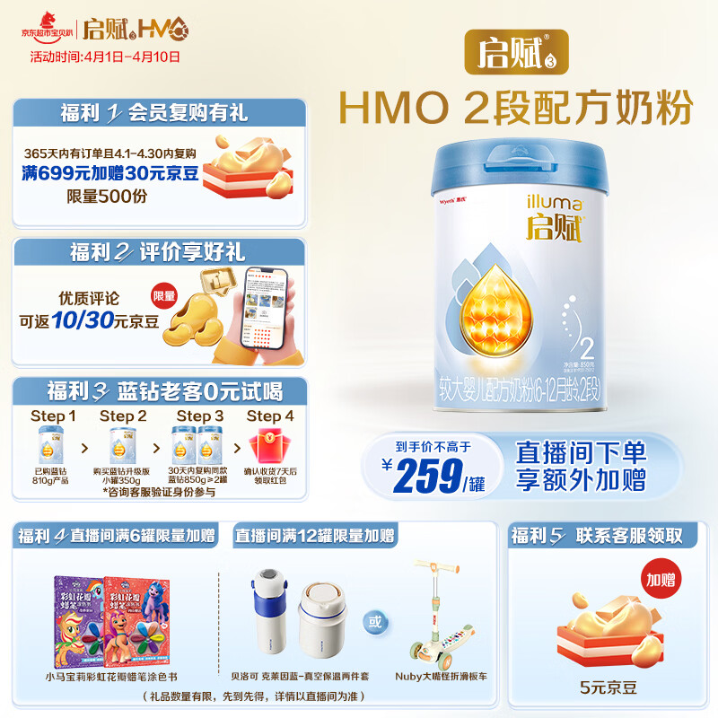 惠氏(Wyeth)启赋蓝钻【加量装】HMO婴儿配方奶粉2段(6-12月)850g 黄金OPO