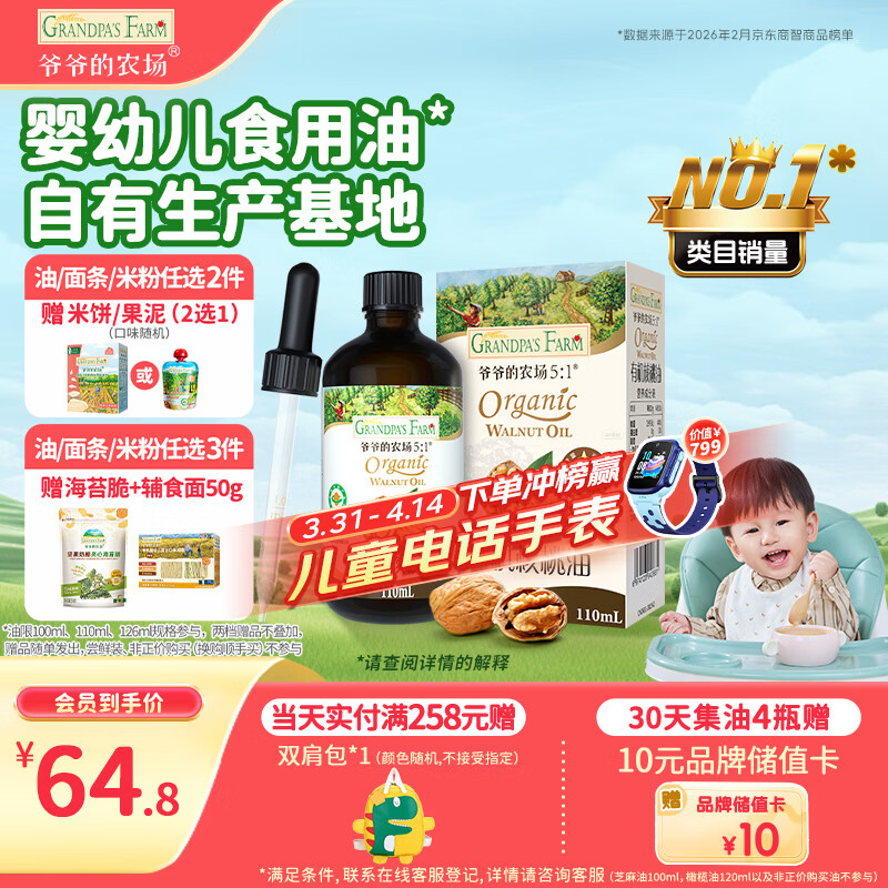 爷爷的农场有机核桃油辅食油110ml 凉拌热炒婴幼儿食用油宝宝辅食6个月以上