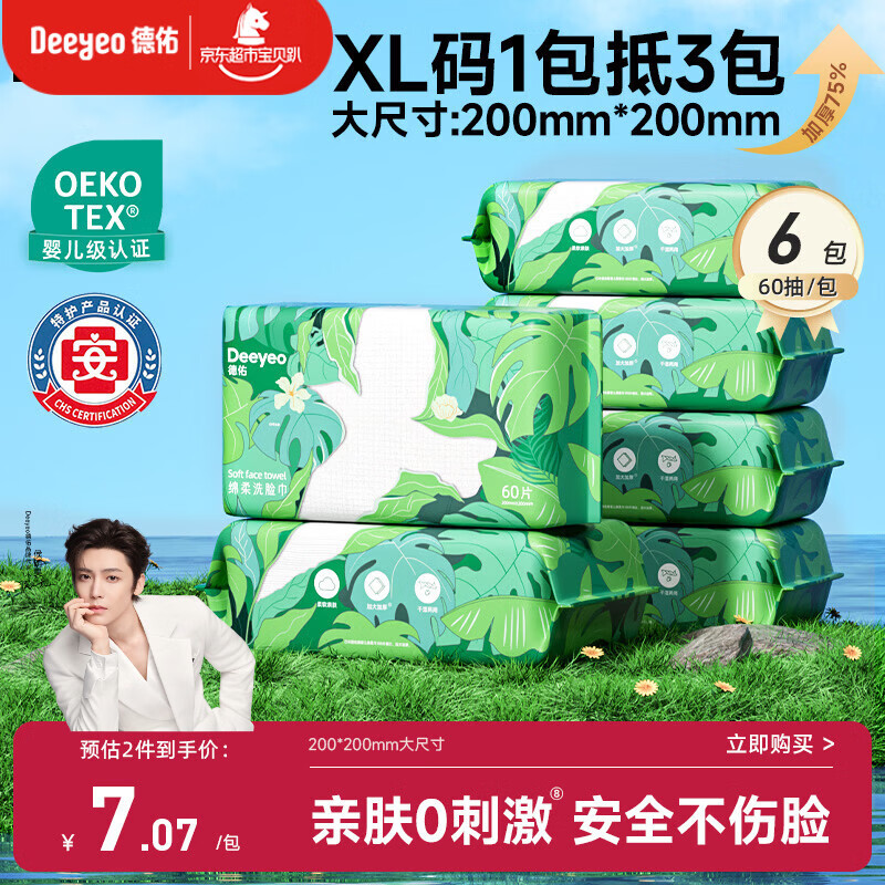 德佑洗脸巾60抽*6包抽取式加大加厚干湿两用一次性棉柔洁面绵柔巾