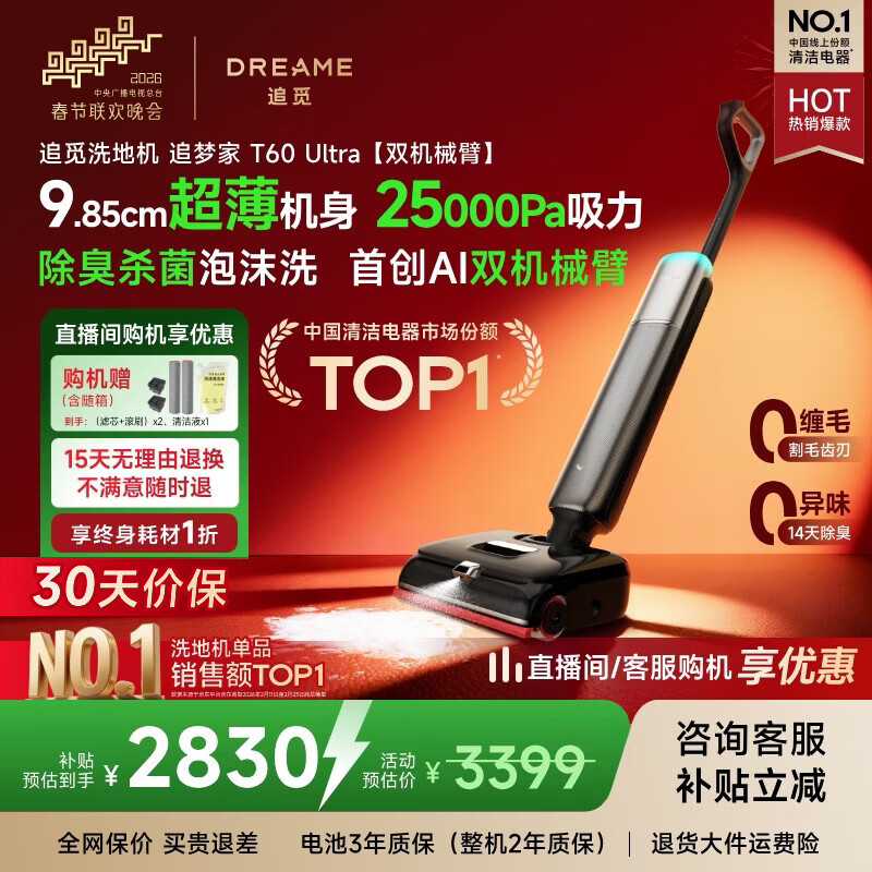 追觅【春晚同款】洗地机追梦家T60Ultra【双机械臂极速干】洗拖吸拖一体机自动清洗家用拖地洗地一体机
