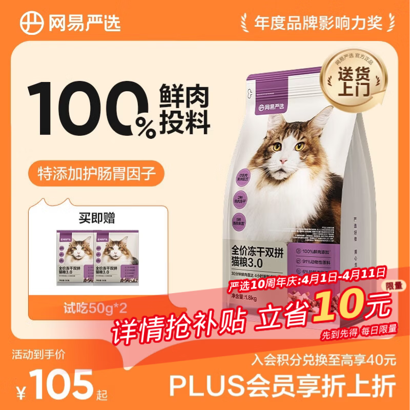 网易严选全价冻干双拼猫猫粮3.0款 主粮成幼猫高鲜肉鸡鸭无谷护肠胃1.8kg