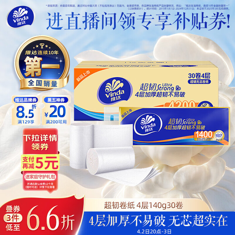 维达(Vinda)无芯卷纸 超韧4层140克*30卷 加厚升级 卫生纸厕纸 卷筒纸 整箱