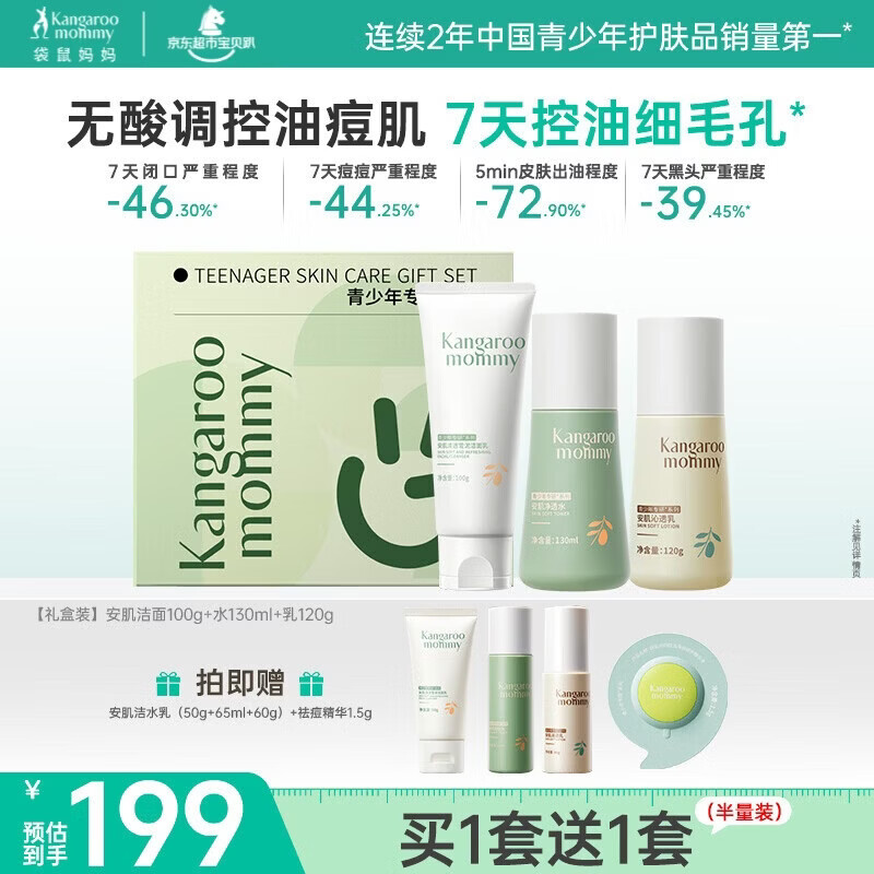袋鼠妈妈青少年护肤套装 控油祛痘洁水乳三件套12-18岁男女孩青春期学生