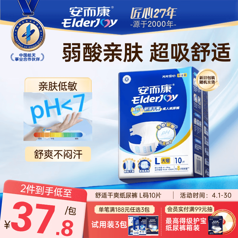 安而康(Elderjoy)舒适干爽成人纸尿裤L10片臀围95-120cm成人尿不湿老人亲肤
