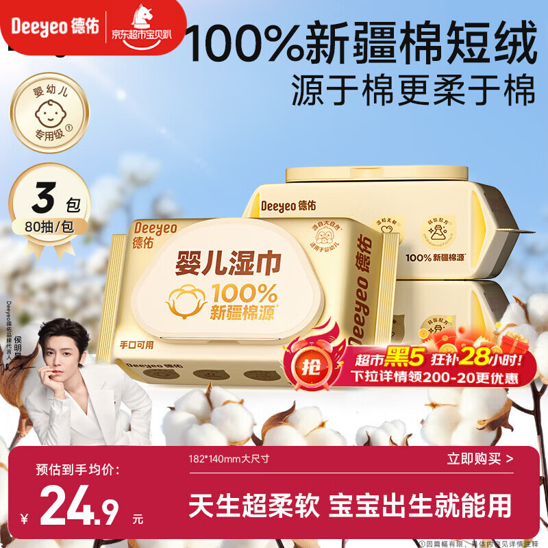 德佑超柔软100%新疆棉源手口湿巾 婴儿湿纸巾80抽*3包新生儿专用t