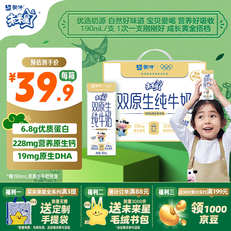 蒙牛未来星双原生DHA成长儿童奶高钙纯牛奶190ml*12盒 送礼盒装