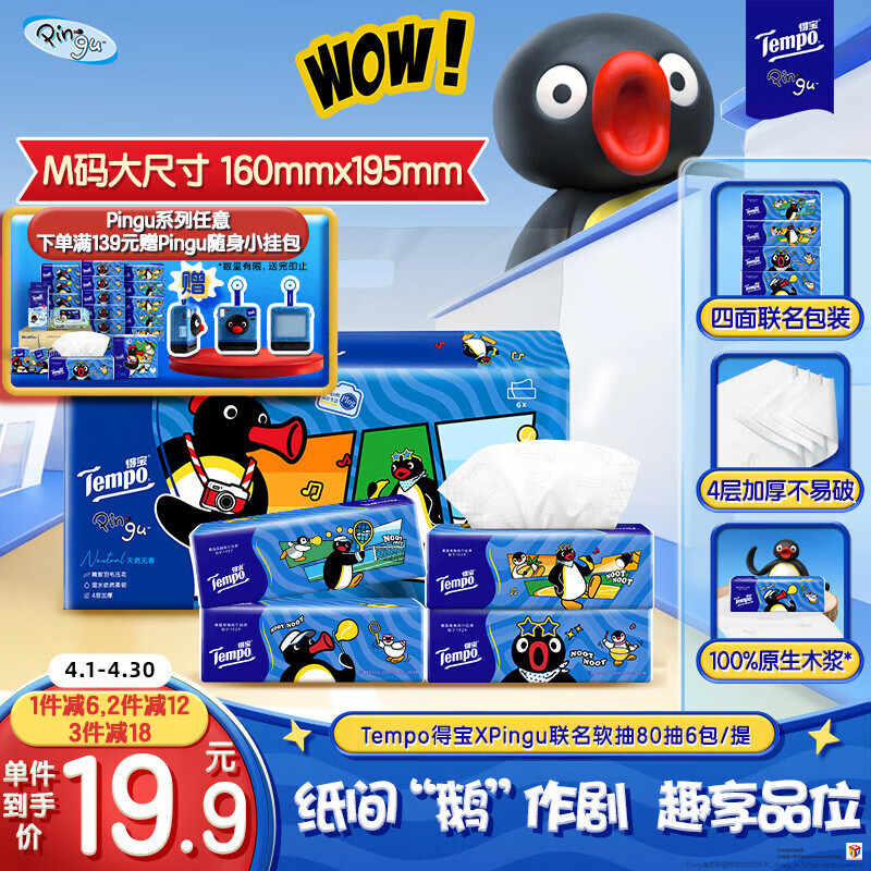 得宝(TEMPO)Pingu联名款抽纸 4层加厚80抽*6包纸巾 餐巾纸 卫生纸