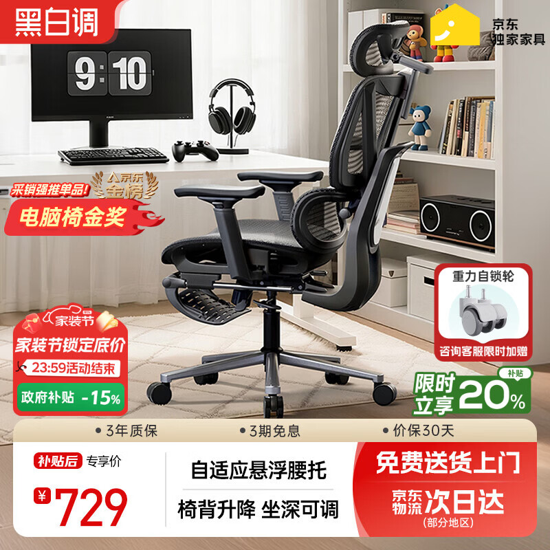 今日推荐:黑白调P3人体工学椅电脑椅办公人工力学座椅学习电竞椅子可躺