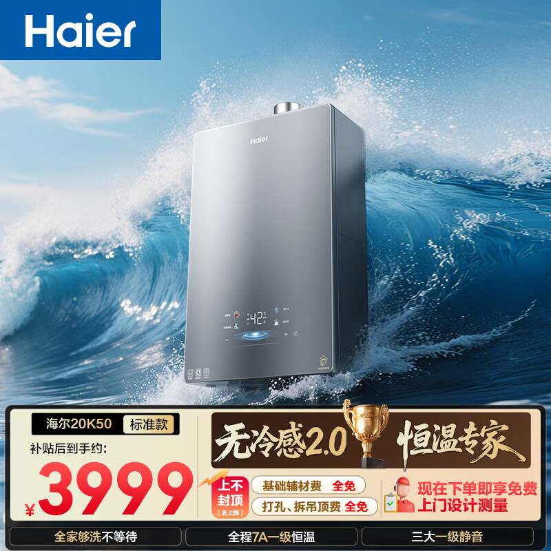 海尔【无冷感K50】20升超大水量 全程7A一级恒温 一级静音 增压大水量 上门安装 家用燃气热水器