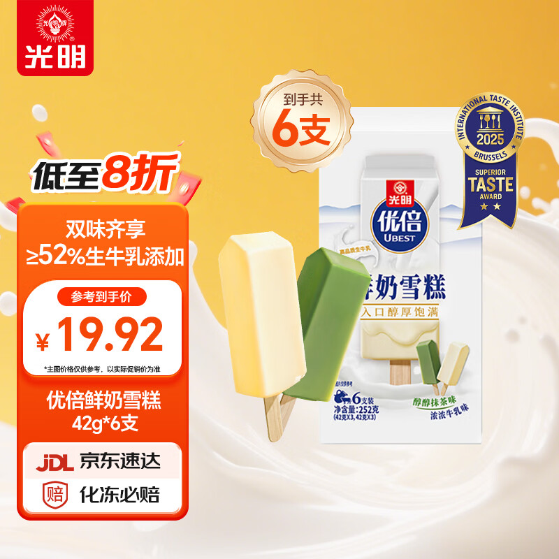 光明牌(Guang Ming Pai)优倍鲜奶雪糕 42g*6支 醇醇抹茶味 浓浓牛乳味冰淇淋冷饮25年生产