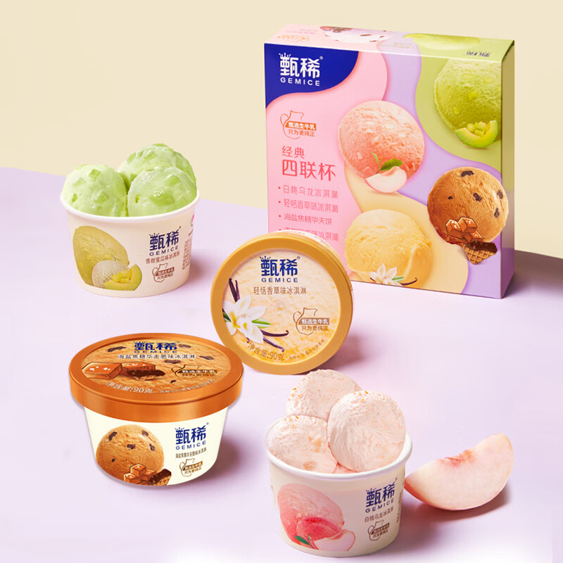 伊利【热巴同款】甄稀四联杯(海盐焦糖+白桃+香草+蜜瓜)冰淇淋90g*4杯