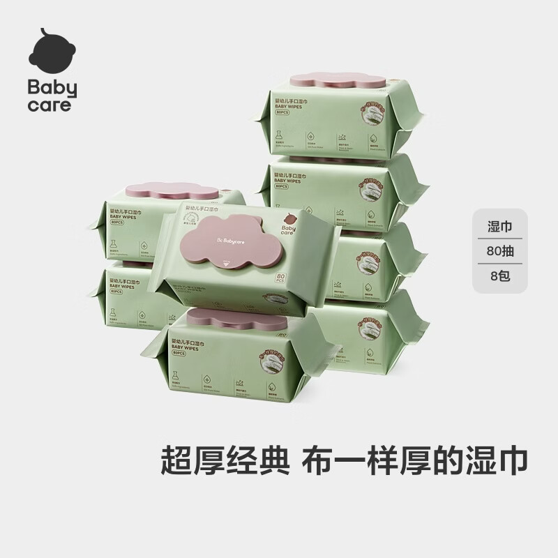 babycare婴儿手口湿巾新生儿加厚擦脸带盖成人可用6480紫盖湿纸巾80抽-8包