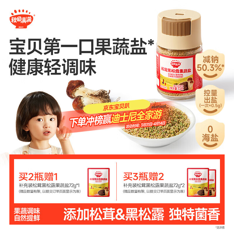 秋田满满 宝宝果蔬盐72g儿童食用盐减钠调味料0添加海盐 送婴儿一岁辅食谱