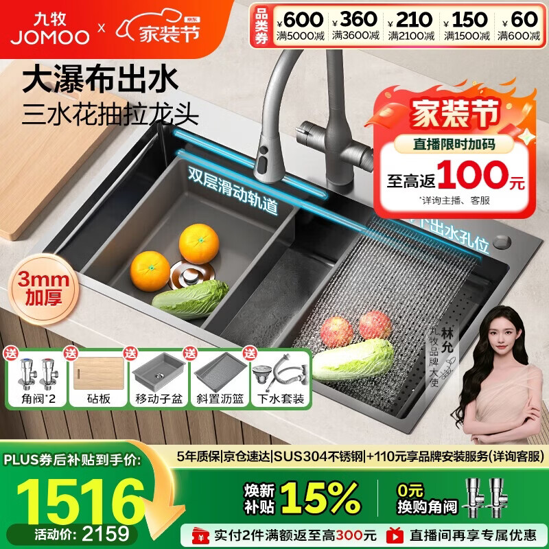 九牧(JOMOO)不锈钢魔法师厨房水槽大单槽洗菜盆飞雨瀑布槽78*48抽拉龙头06388