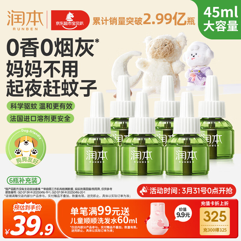 润本蚊香液电蚊香液驱蚊液45ml*6瓶驱蚊防蚊补充装(无蚊香加热器)