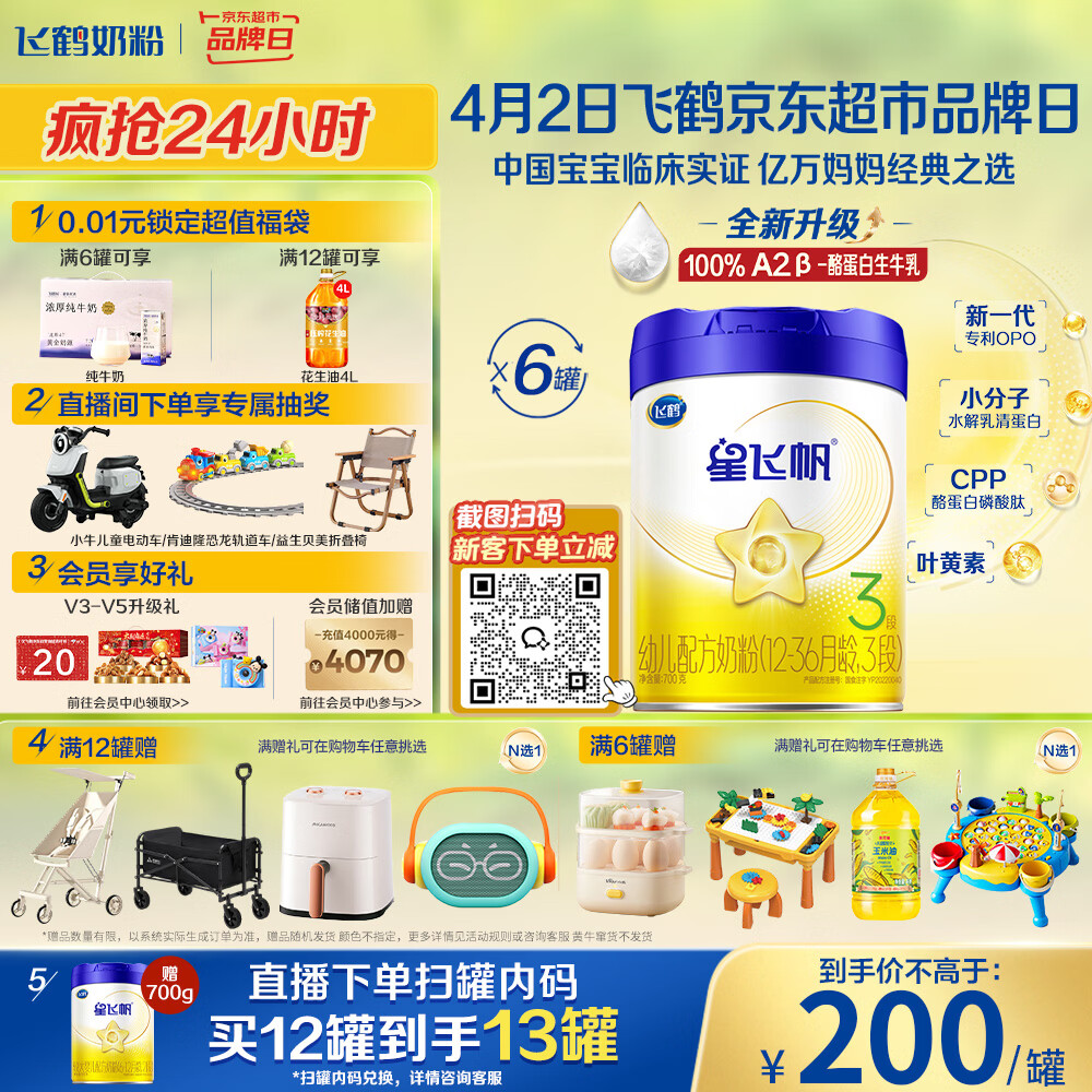 飞鹤星飞帆 婴幼儿配方奶粉3段(1-3岁) 700g*6罐 专利OPO 育儿补贴