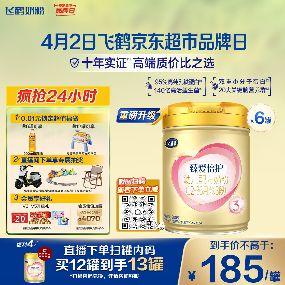 飞鹤臻爱倍护超级飞帆 婴幼儿配方奶粉3段(1-3岁)900g*6罐 乳铁蛋白
