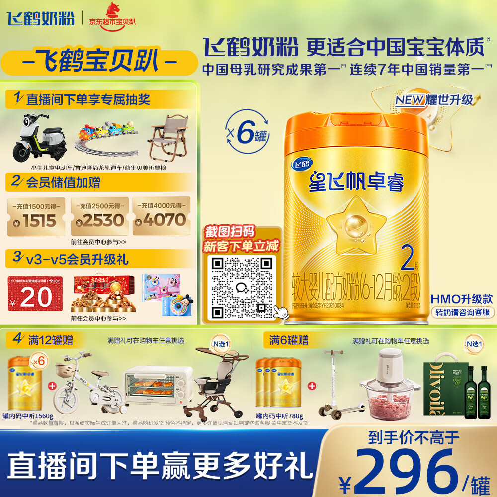 飞鹤星飞帆卓睿Pro A2配方升级HMO婴儿配方奶粉2段(6-12月)758g*6罐